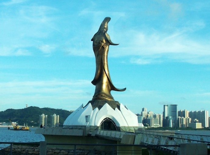 观音像坐落在新口岸新填海区对面海面。由葡萄牙雕塑设计师李洁莲设计,南京晨光集团公司铸造。铜像高21米,造价达3000多万澳门元。观音像的莲花基座旁为佛教文化中心。中心是一座直径长19.5米的半球体建筑,高两层,建筑面积约600平方米,采取地库设计。地下一层为图书馆。并以卡通、连环画、音乐等多媒体形式,介绍儒、释、道三大东方宗教信仰及文化。