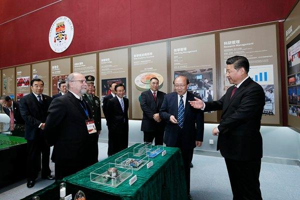 一行到达澳门大学展览馆,社会文化司司长谭俊荣、澳门大学校长赵伟、澳门大学校董会主席林金城在场迎接。习主席首先观看沙盘,听取澳门大学校长赵伟介绍。校长先谈到澳大的整体规划、历史和办学理念,又特别介绍仿真与混合信号超大规模集成电路国家重点实验室及中药质量研究国家重点实验室的科研成就,最后他再向主席介绍澳门大学图书馆的珍藏古籍。