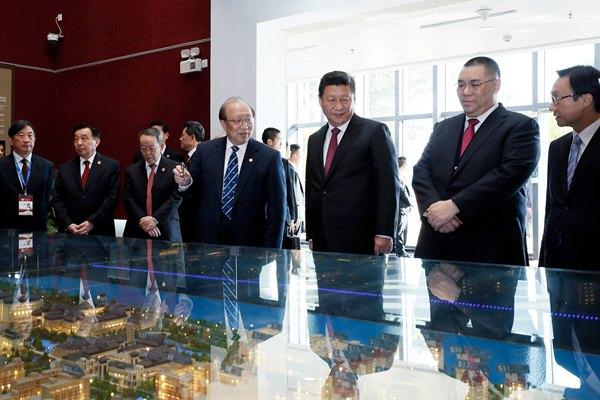 国家主席习近平观看澳大新校区的沙盘并听取大学整体规划的介绍