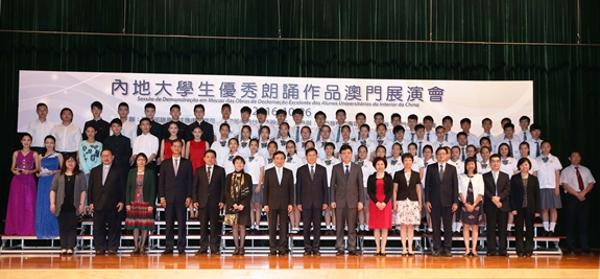 内地大学生优秀朗诵作品澳门展演会由教育部语言文字应用管理司、教育部港澳台事务办公室主办,澳门教育暨青年局承办,澳门中华教育会协办,旨在展示中华语言的深厚魅力,使广大师生体味中华文化的广博与精深。来自中国传媒大学、重庆大学主持专业的16名优秀学生,用自己有声的语言精彩朗诵了《少年中国说》《出师表》等名篇。劳工子弟学校老师和教业中学学生也同台演出,获得在场师生的阵阵掌声。