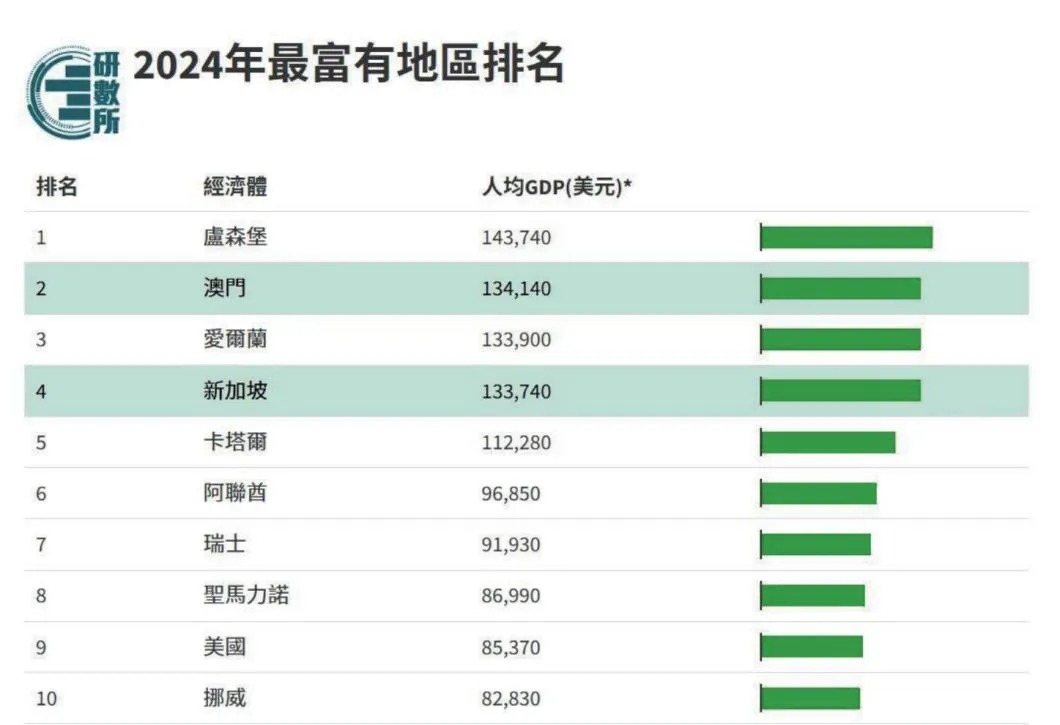 在《福布斯》杂志2025年初公布的2024年度全球最富有国家及地区排行榜中,澳门以其实质人均地区生产总值(GDP)13.4万美元,摘得亚洲最富裕地区桂冠,全球排名第二,仅次于传统欧洲富裕国家卢森堡的14.3万美元。