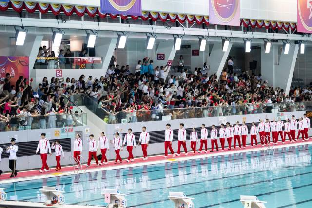2024年8月,由内地奥运健儿访港代表团参加的“奥运健儿展风采”——跳水及游泳示范表演在香港维多利亚公园游泳池举行。新华社发