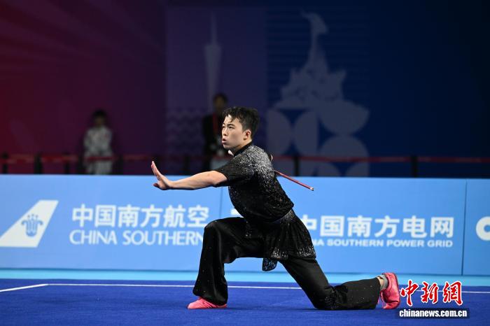 11月7日,第十五届全国运动会武术套路男子长拳刀术棍术全能比赛在广州南沙体育馆举行。图为香港选手何彦政在棍术比赛中。中新社记者 陈楚红 摄