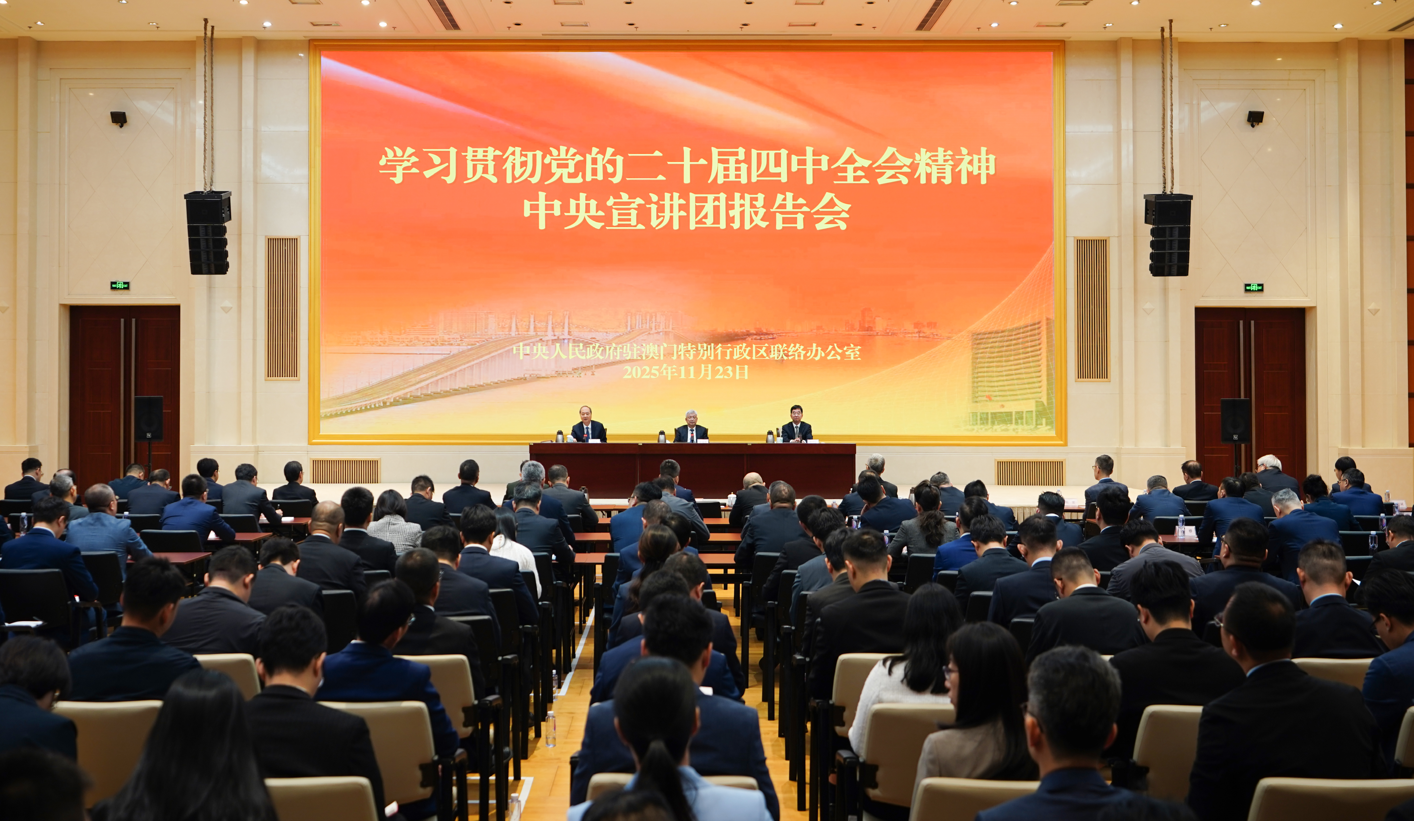 本网讯 11月23日,学习贯彻党的二十届四中全会精神中央宣讲团成员,中国科学院院长、党组书记侯建国,中央财经委员会办公室副主任、中央农村工作领导小组办公室副主任祝卫东在澳门向中央驻澳机构和中资企业负责人宣讲。中央人民政府驻澳门特别行政区联络办公室主任郑新聪主持并讲话。中央驻澳机构和中资企业有关负责人等360人参加。
