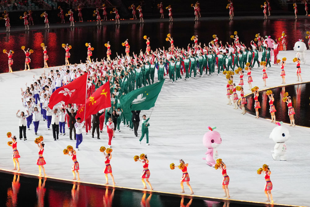 11月9日,第十五届全国运动会开幕式在广东奥林匹克体育中心举行。图为广东省体育代表团、香港特别行政区体育代表团和澳门特别行政区体育代表团在入场仪式上共同入场。新华社记者 薛宇舸 摄