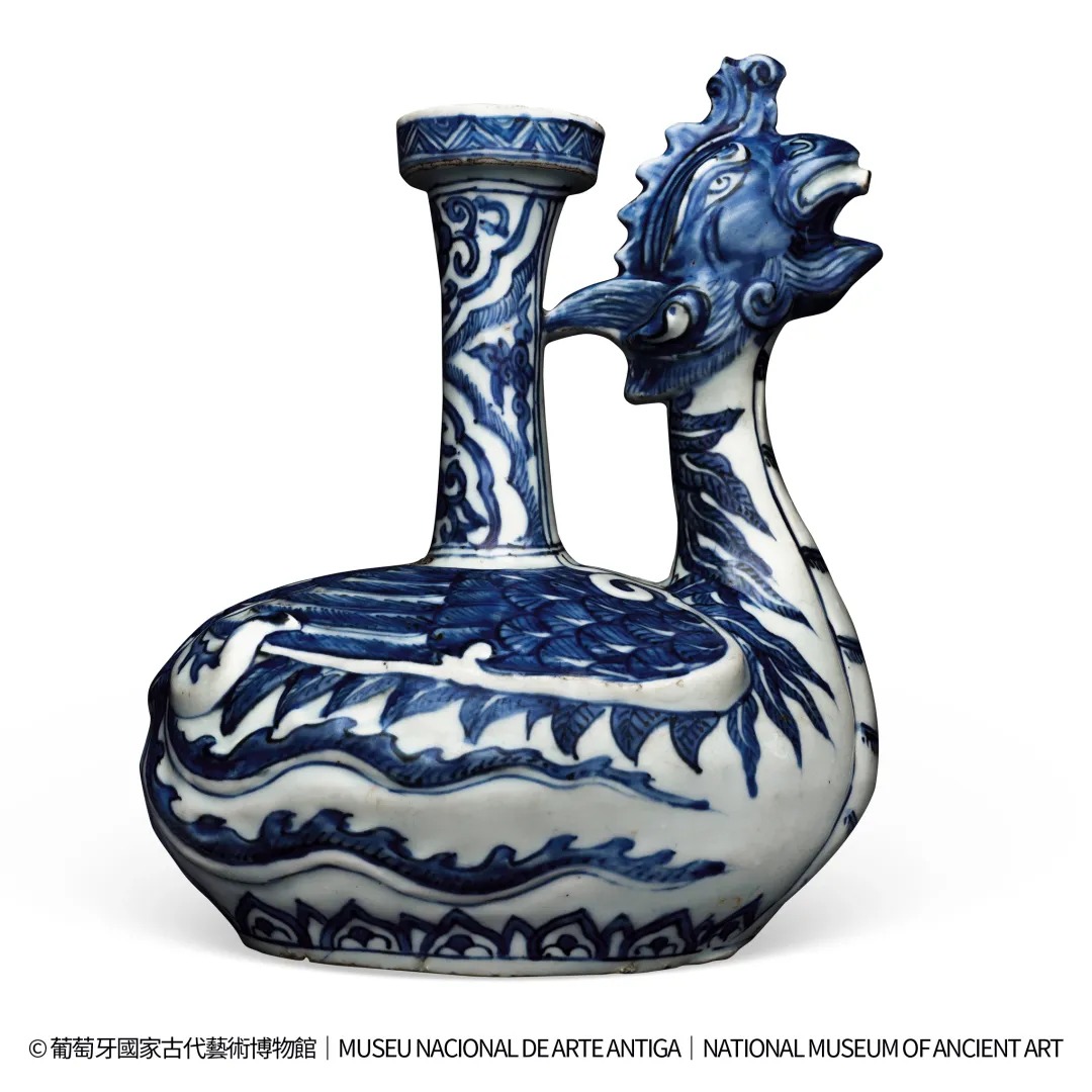 军持为中国陶瓷器皿,形制多变,尤受葡萄牙等欧洲名流贵族青睐。青花凤形军持呈凤凰蹲踞造型,翼尾采用浮雕模制技法,头部延伸为喙状流口,背部设喇叭形长颈管。胎体为白瓷施透明釉,釉下以钴蓝料绘饰,通过青花浓淡变化突出羽毛与头部的立体感。底部饰缠枝纹带,颈管处开光内绘折枝花卉及云纹。