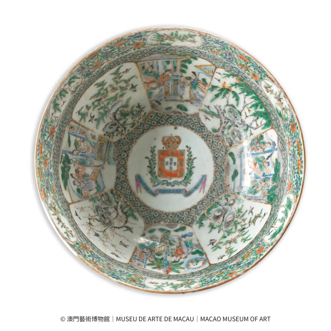 广彩澳门总督衙门纹章开光人物花鸟图潘趣碗,外壁及内壁纹饰相近,上方均为六组椭圆形开光及花卉纹相间排列,开光内为以鸟搭配花或柳树的主题图案,下方均为八组扇形开光,内相间分布有中式明装人物、以鸟搭配花、柳树或树枝构成的主题图案。外底有墨书“澳门总督衙门”六字楷书款。