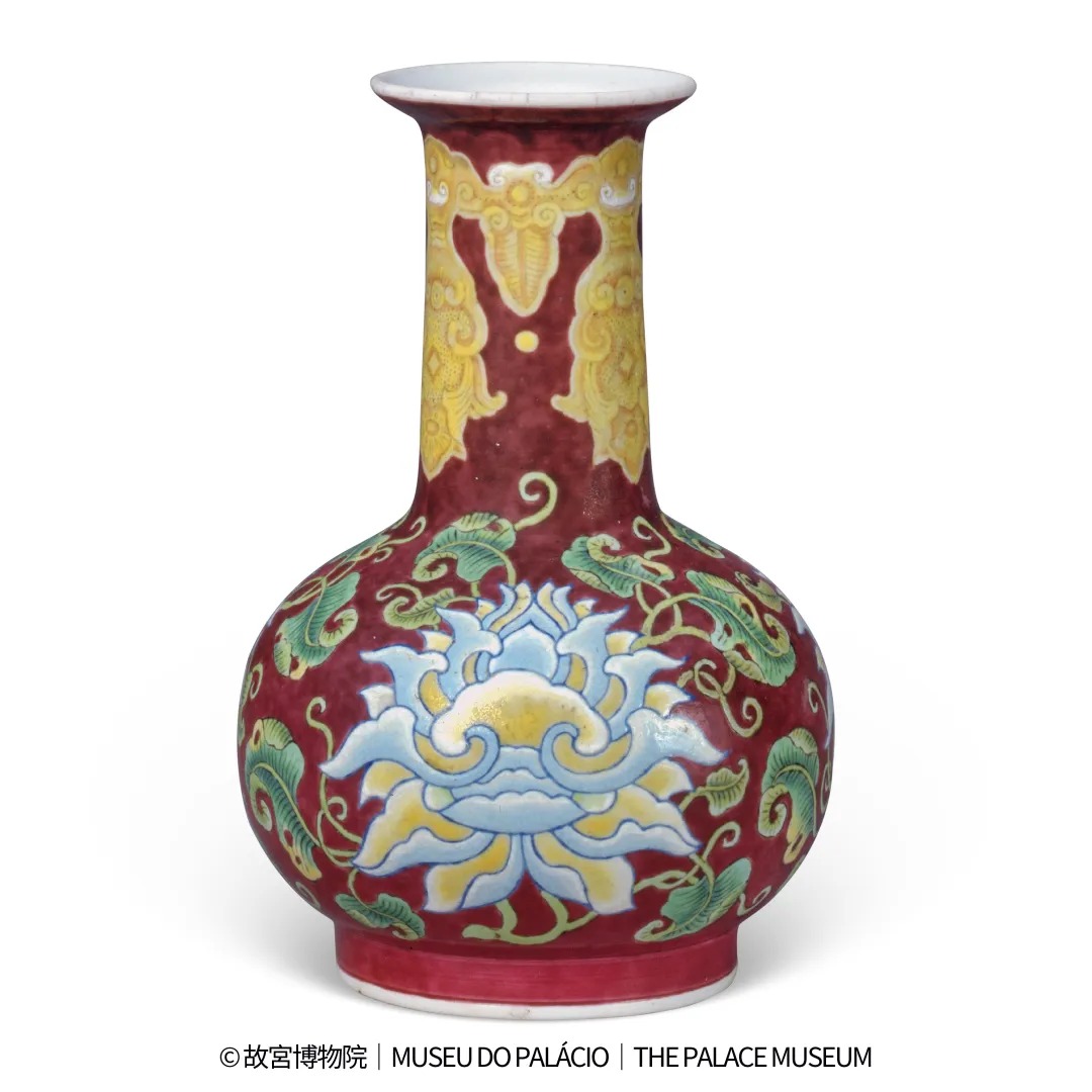 胭脂紫地珐琅彩折枝莲纹瓶,内壁施白釉,外壁通体以胭脂紫地珐琅彩装饰。颈部以黄料彩绘变形蝉纹和三角纹,腹部以蓝、白、黄三色绘西番莲,间饰绿叶。外底刻“康熙御制”四字楷书款。