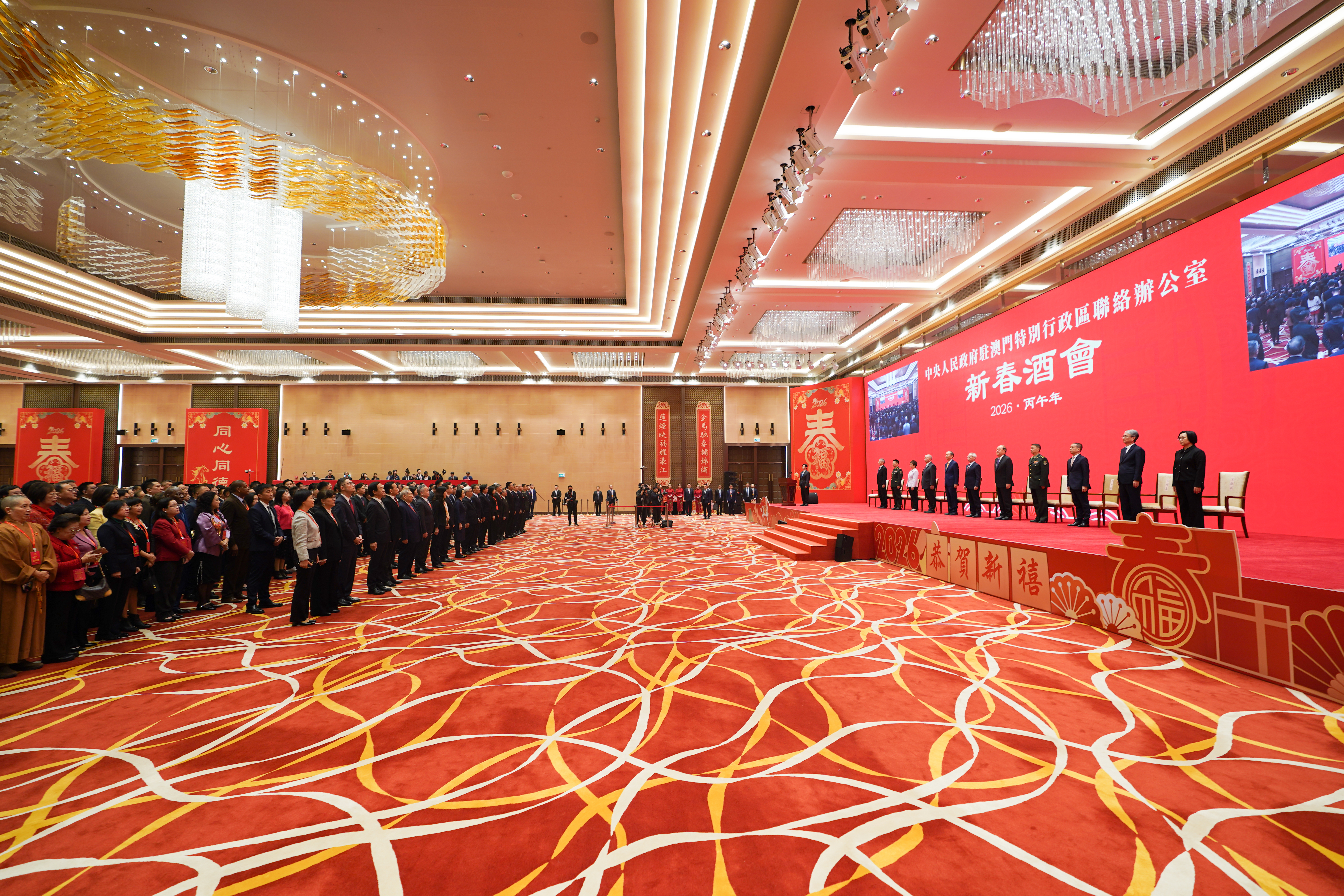 本网讯 2月5日下午,中央政府驻澳门联络办公室举办2026年新春酒会。受中央港澳办主任、国务院港澳办主任夏宝龙委托,中央港澳办副主任、国务院港澳办副主任,中央政府驻澳门联络办公室主任郑新聪代表夏宝龙主任、中央港澳办、国务院港澳办和中央政府驻澳门联络办公室向广大澳门居民致以新春祝福。澳门特别行政区行政长官岑浩辉出席并致辞,全国政协副主席何厚铧,前行政长官贺一诚,外交部驻澳门特派员公署特派员卞立新,解放军驻澳门部队司令员于长江、政委林庆华,中央政府驻澳门联络办公室副主任黄柳权、吕玉印、张应杰,以及特别行政区立法、司法机构主要负责人,特别行政区政府主要官员,澳区全国人大代表、全国政协委员,特别行政区行政会委员、立法会议员,以及澳门社会各界代表人士约1300人出席酒会。