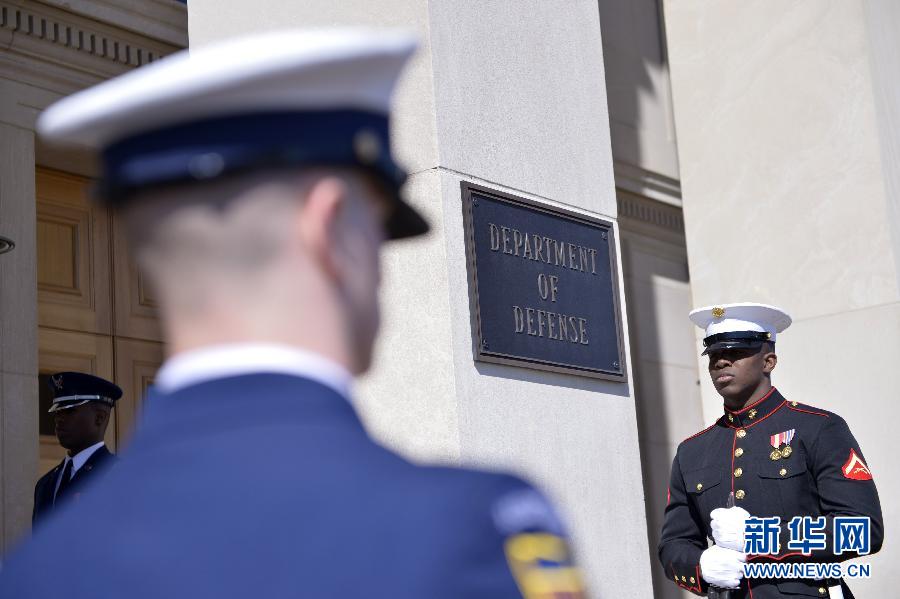 这是美军仪仗队士兵在五角大楼外参加仪式的资料照片(2014年3月31日摄)。美国五角大楼8月8日说,美军当天已向“伊拉克和黎凡特伊斯兰国”极端组织在伊拉克北部的目标发动空袭。 新华社记者殷博古摄