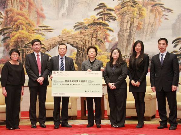 8月7日上午,仇鸿副主任会见中银澳门副行长、中银青协会会长陈晓平一行,代表中联办接收中银澳门员工向云南鲁甸地震灾区募捐的316万澳门元善款。