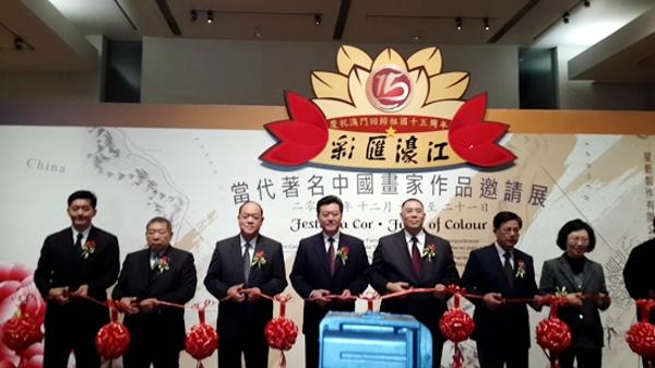 本网讯 12月16日,“彩汇濠江——当代著名中国画家作品邀请展”在澳门回归贺礼陈列馆开幕。该展为庆祝澳门回归祖国十五周年献礼,由澳门特区政府民政总署、中国国家画院及澳门公务人员文化协会联合举办,共展出37位当代中国著名画家近80件精品画作,向澳门及海内外观众展现当代中国绘画风采。