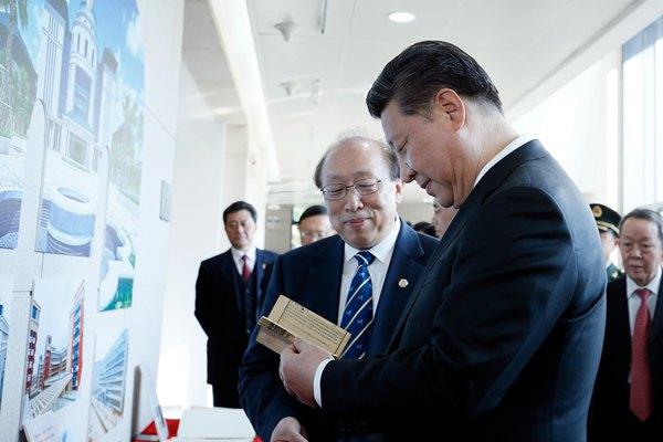 一行到达澳门大学展览馆,社会文化司司长谭俊荣、澳门大学校长赵伟、澳门大学校董会主席林金城在场迎接。习主席首先观看沙盘,听取澳门大学校长赵伟介绍。校长先谈到澳大的整体规划、历史和办学理念,又特别介绍仿真与混合信号超大规模集成电路国家重点实验室及中药质量研究国家重点实验室的科研成就,最后他再向主席介绍澳门大学图书馆的珍藏古籍。