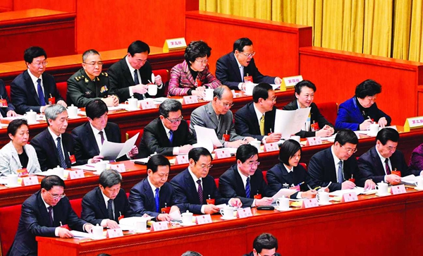 3月8日全国人大三次会议上,李刚、李沛霖在主席台上审阅工作报告。(图片来源:澳门日报)