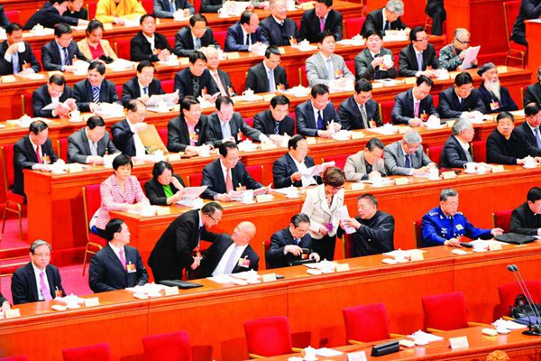 3月11日,陈明金发言前与全国政协常委杨俊文握手。(图片来源:澳门日报)