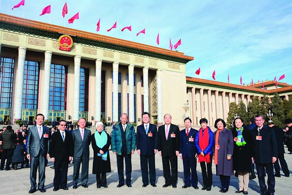 3月4日,部分澳区全国人大代表与中联办主任李刚、副主任陈斯喜在人民大会堂外留影。(图片来源:澳门日报)