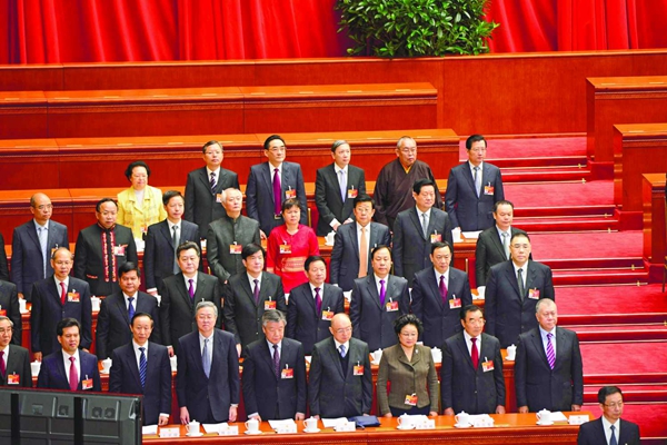 3月5日十二届全国人大三次会议开幕上,何厚铧、崔世安、李刚、李沛霖在主席台上。(图片来源:澳门日报)