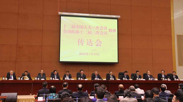3月19日下午,澳门中联办召开全国“两会”精神传达会。全国政协副主席何厚铧、澳门特区行政长官崔世安、中联办主任李刚讲话;澳区全国人大代表团团长、全国人大常委、特区立法会主席贺一诚,全国政协常委杨俊文分别传达了人大、政协会议精神。中联办副主任陈斯喜主持会议。中联办负责人,特区主要官员,澳区第十二届全国人大代表、全国政协委员,建制内人士,以及中联办机关干部、有关驻澳机构和主要中资企业负责人等400余人参加会议。