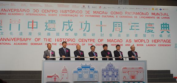 作为“澳门历史城区”申遗成功十周年系列庆祝活动之一,澳门申遗成功十周年庆典暨文化遗产保护国际学术研讨会及新书发行仪式,吸引了来自世界各地的30余位学者及近200名文化遗产领域代表出席。澳门社会文化司司长谭俊荣、国家文物局副局长童明康、北京故宫博物院院长单霁翔、澳门中联办文教部副部长张晓光、外交部驻澳公署公共外交与新闻部副主任李孝劝、澳门文化局局长吴卫鸣及澳门大学校长赵伟出席并担任主礼嘉宾。