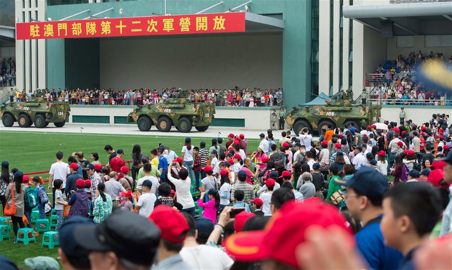 5月1日,大批澳门市民观看装甲兵专业技能演练。当日,中国人民解放军驻澳门部队氹仔军营举行开放日活动,吸引了约3000名市民前来参观。 新华社记者 张金加 摄