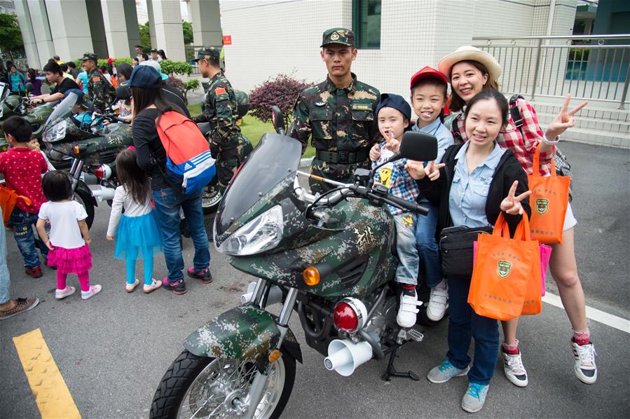 5月1日,澳门市民与驻澳部队战士合影。当日,中国人民解放军驻澳门部队氹仔军营举行开放日活动,吸引了约3000名市民前来参观。 新华社记者 张金加 摄