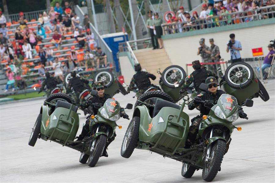 5月1日,澳门市民观看女子摩托车驾驶演练。当日,中国人民解放军驻澳门部队氹仔军营举行开放日活动,吸引了约3000名市民前来参观。 新华社记者 张金加 摄