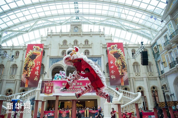 近日,由澳门美高梅与澳门武术总会合办的年度国际醒狮大赛“美高梅狮王争霸-澳门国际邀请赛2016”在澳门美高梅举行,共有来自世界各地的23支醒狮劲旅参加。图为大赛当天,参赛者为评委和观众呈现精彩的醒狮表演。(图片来源:新华社)