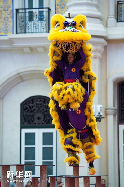 近日,由澳门美高梅与澳门武术总会合办的年度国际醒狮大赛“美高梅狮王争霸-澳门国际邀请赛2016”在澳门美高梅举行,共有来自世界各地的23支醒狮劲旅参加。图为大赛当天,参赛者为评委和观众呈现精彩的醒狮表演。(图片来源:新华社)