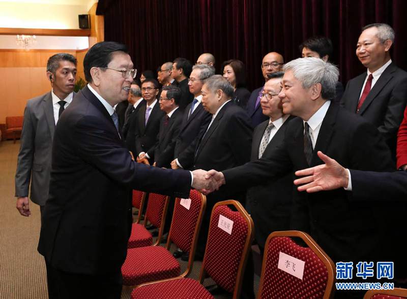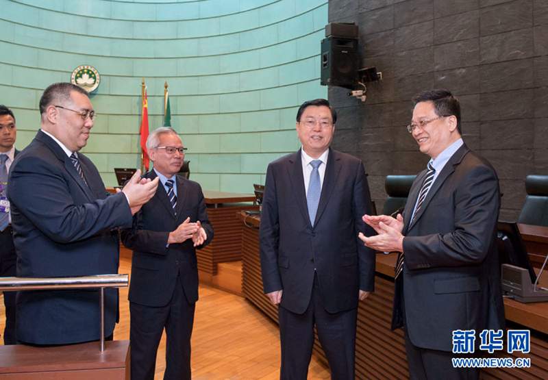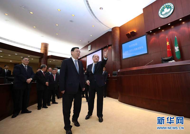 在澳门特区立法会,张德江参观了全体会议厅,听取了情况介绍并与全体议员合影。他说,立法会是依据基本法设立的立法机关,是特别行政区政治体制的重要组成部分。回归以来,立法会认真履行职责,依法支持、配合、监督特区政府施政,为维护国家的主权、安全、发展利益作出了重要贡献,体现了责任担当。立法会之所以取得这些成效,就在于能够秉承法治精神,依照宪法和基本法办事,保持与特区行政机关的良性互动;坚持基本法确立的立法会制度安排,实现了选举民主与协商民主的有机融合。这些经验弥足珍贵,要持久地坚持下去并发扬光大。