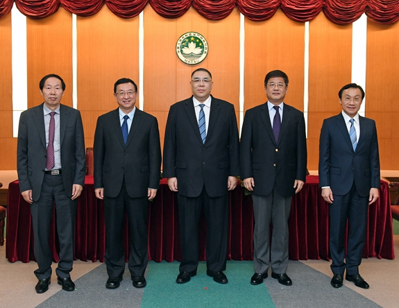 当晚,郑晓松主任、薛晓峰副主任在新竹苑会见雒树刚部长、刘玉珠局长一行。郑晓松主任介绍了澳门特区和中央政府驻澳门联络办公室有关情况,他指出,澳门有良好的爱国爱澳传统、与葡语系国家联系紧密的优势,但文化事业和文化产业发展与经济发展不平衡,加强与内地文化交流、推动澳门文化发展还有很大空间。郑晓松主任感谢文化部和国家文物局长期以来对澳门文化文物工作的大力支持,希望在2018年举办的“中国与葡语国家文化部长高峰论坛暨文化艺术节”、庆祝澳门回归20周年文艺晚会和文化活动筹备、“复兴之路”大型展览精编版在澳展出、内地优秀文化艺术活动到澳展演等工作上继续得到两部门的支持帮助,进一步弘扬中华优秀传统文化,促进澳门文化繁荣和经济多元发展。