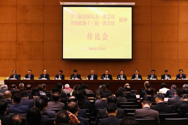 本网讯 3月26日下午,中央政府驻澳门联络办公室召开2018年全国“两会”精神传达会。全国政协副主席何厚铧、澳门特区行政长官崔世安、中央政府驻澳门联络办公室主任郑晓松分别讲话。澳区全国人大代表团团长、全国人大常委、特区立法会主席贺一诚,全国政协常委廖泽云分别传达十三届全国人大一次会议和全国政协十三届一次会议精神。中央政府驻澳门联络办公室副主任陈斯喜主持会议。中央政府驻澳门联络办公室副主任姚坚、孙达,以及特区主要官员,澳区第十二届、十三届全国人大代表和全国政协委员,建制内人士,中央政府驻澳门联络办公室机关处长以上干部、有关驻澳机构和主要中资企业负责人等450多人参加会议。