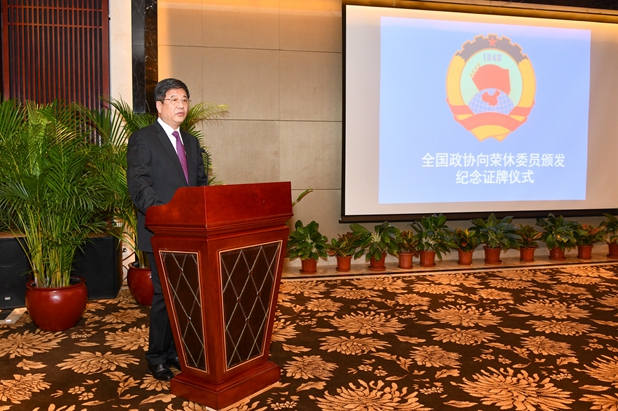 颁牌仪式由吕虹主持,潘立刚和郑晓松主任分别发表讲话,杨俊文代表不再连任的委员发言。随后,在《喜洋洋》的音乐声中,何厚铧和潘立刚共同为不再连任的澳区十二届全国政协常委和委员逐一颁发纪念证牌和荣誉证并合影。