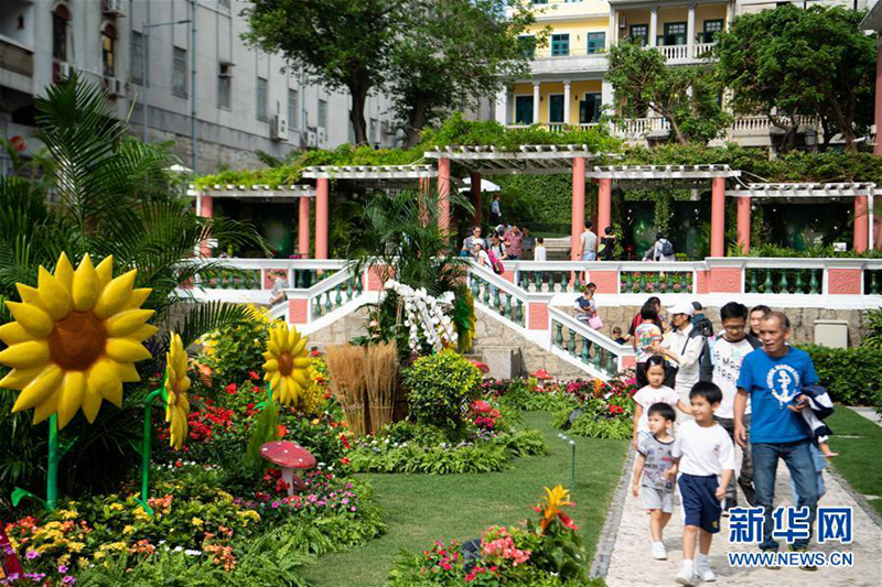 10月27日,在澳门特区政府总部,市民和游客在参观留影。澳门特区政府总部于10月27日至28日举行开放日活动,市民和游客可听取导赏员讲解澳门特区政府总部内部陈设,并参观主题为“绿野仙踪”的花卉展。 (新华社 张金加摄)