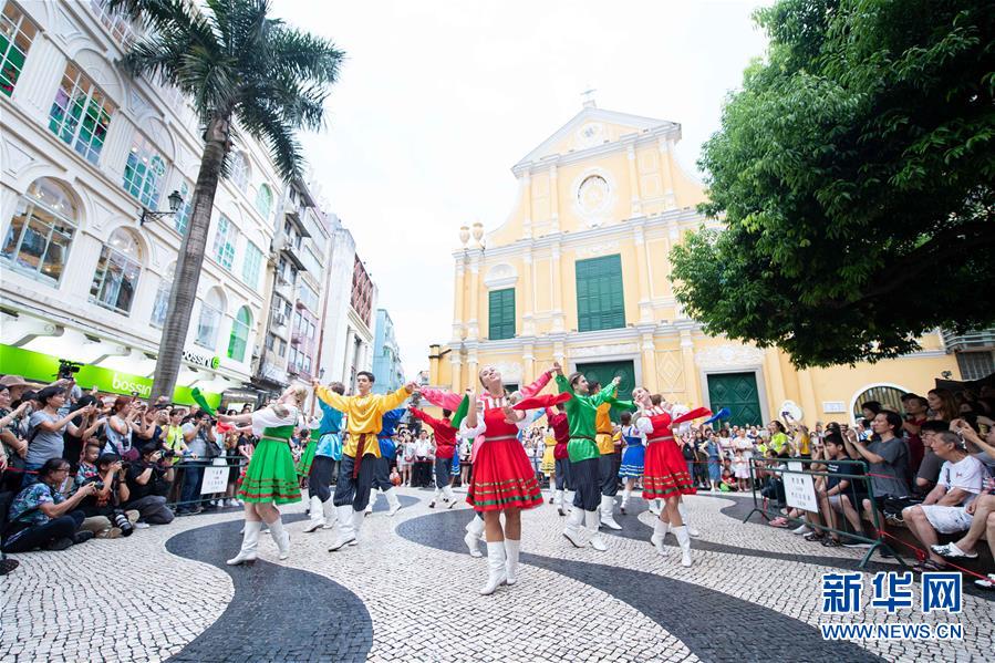 7月20日,演员在澳门玫瑰堂前进行澳门国际青年舞蹈节巡游表演。