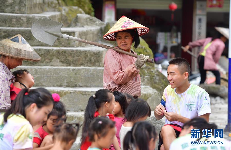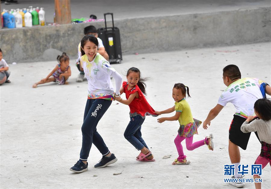 志愿者何依琳(左一)和乌英苗寨的孩子们玩“老鹰捉小鸡”游戏。 新华社 黄孝邦 摄