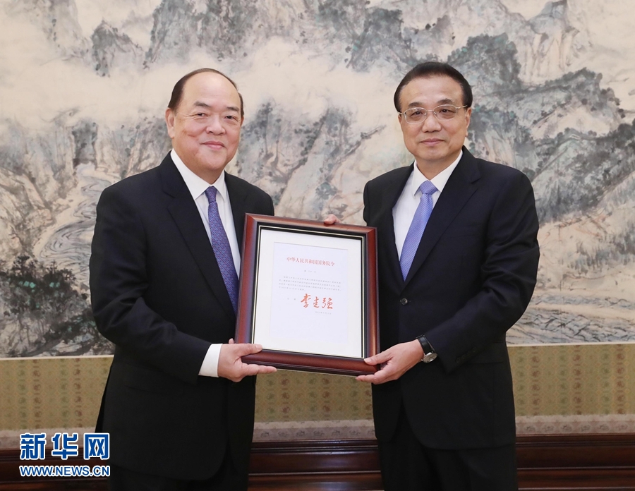 国务院总理李克强9月11日上午在中南海紫光阁会见贺一诚,颁发任命他为中华人民共和国澳门特别行政区第五任行政长官的国务院第719号令。