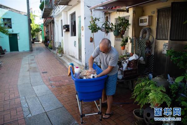 澳门居民在路环渔村给小狗洗澡。 新华社 张金加 摄