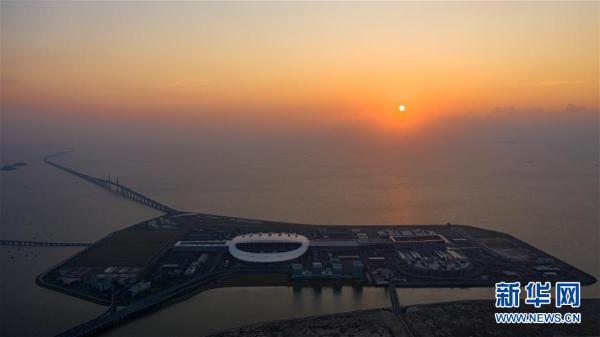 港珠澳大桥珠澳口岸人工岛的日出(无人机拍摄)。 新华社 张金加 摄