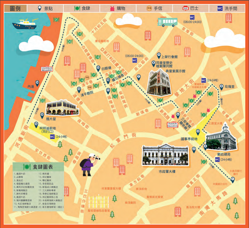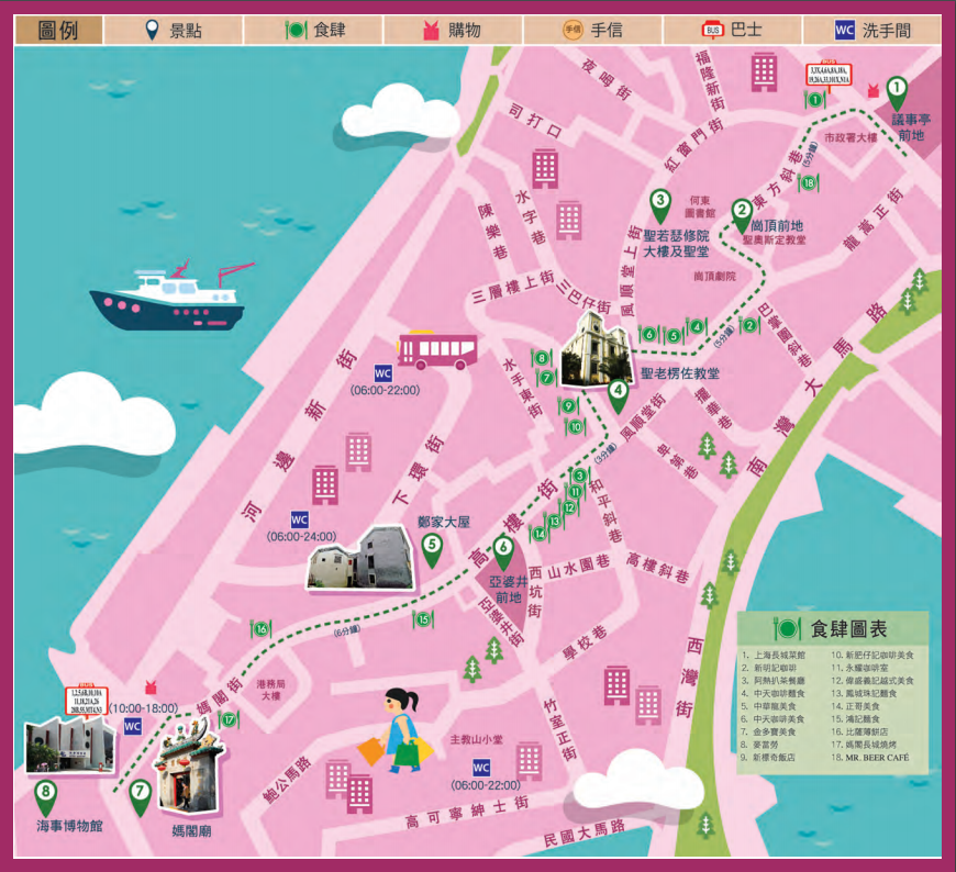 议事亭前地→岗顶前地→圣若瑟修院大楼及圣堂→圣老楞佐教堂→郑家大屋→亚婆井前地→妈阁庙→海事博物馆
