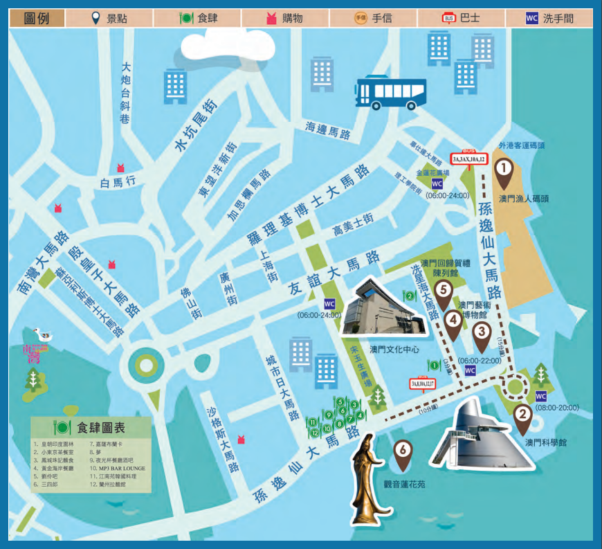 澳门渔人码头→澳门科学馆→澳门文化中心→澳门艺术博物馆→澳门回归贺礼陈列馆→观音莲花苑