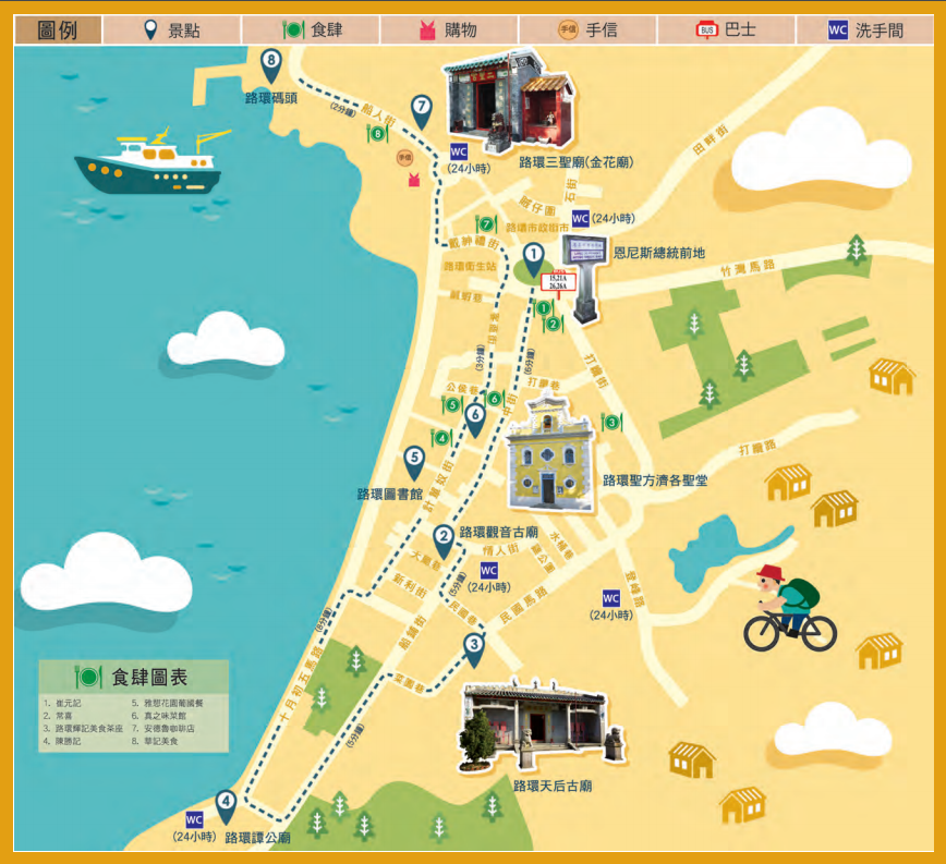 恩尼斯总统前地→路环观音古庙→路环天后古庙→谭公庙→路环图书馆→路环圣方济各圣堂→路环三圣宫(金花庙)→路环码头