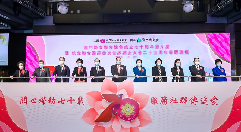 本网讯 11月27日下午,澳门妇女联合总会在澳门旅游塔举办成立70周年图片展暨纪念联合国第四次世界妇女大会25周年专题论坛,中央政府驻澳门联络办公室主任傅自应、副主任严植婵出席,并与澳门特区行政长官贺一诚,全国妇联副主席、书记处书记夏杰,外交公署署理特派员王冬,澳门特区政府行政法务司司长张永春、社会文化司司长欧阳瑜、运输工务司司长罗立文,澳门基金会行政委员会主席吴志良,广东省妇联主席许红,澳门妇联总会会长贺定一共同主礼。