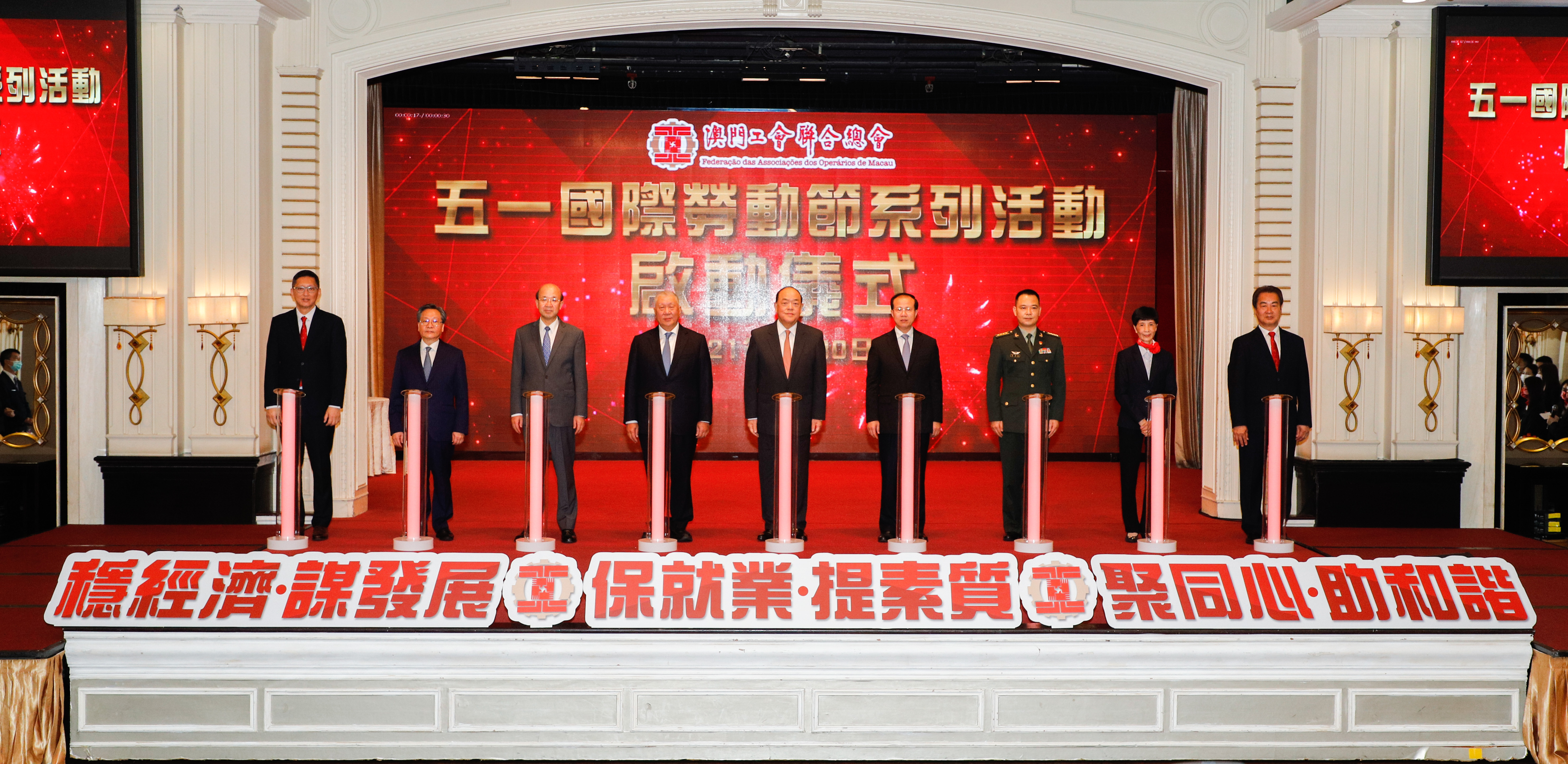 本网讯 4月30日下午,中央政府驻澳门联络办公室主任傅自应出席澳门工会联合总会庆祝“五一”国际劳动节大会,与澳门特区行政长官贺一诚、全国政协副主席何厚铧、外交公署特派员刘显法、驻澳部队副司令员戴劲松、澳门立法会主席高开贤、工联总会会长何雪卿等共同主礼。