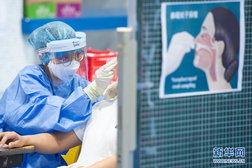 8月4日,一名医护人员在澳门利玛窦中学全民核酸检测站为市民采样。(新华社记者 张金加 摄)