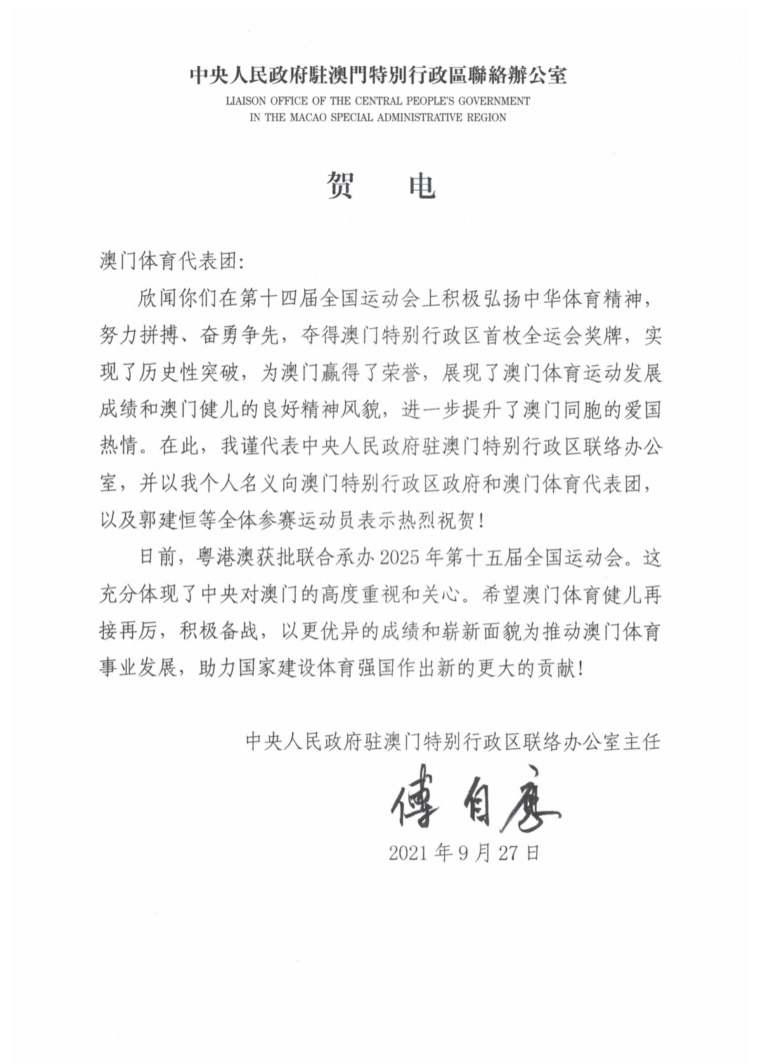 傅自应向第十四届全运会澳门体育代表团致发贺电