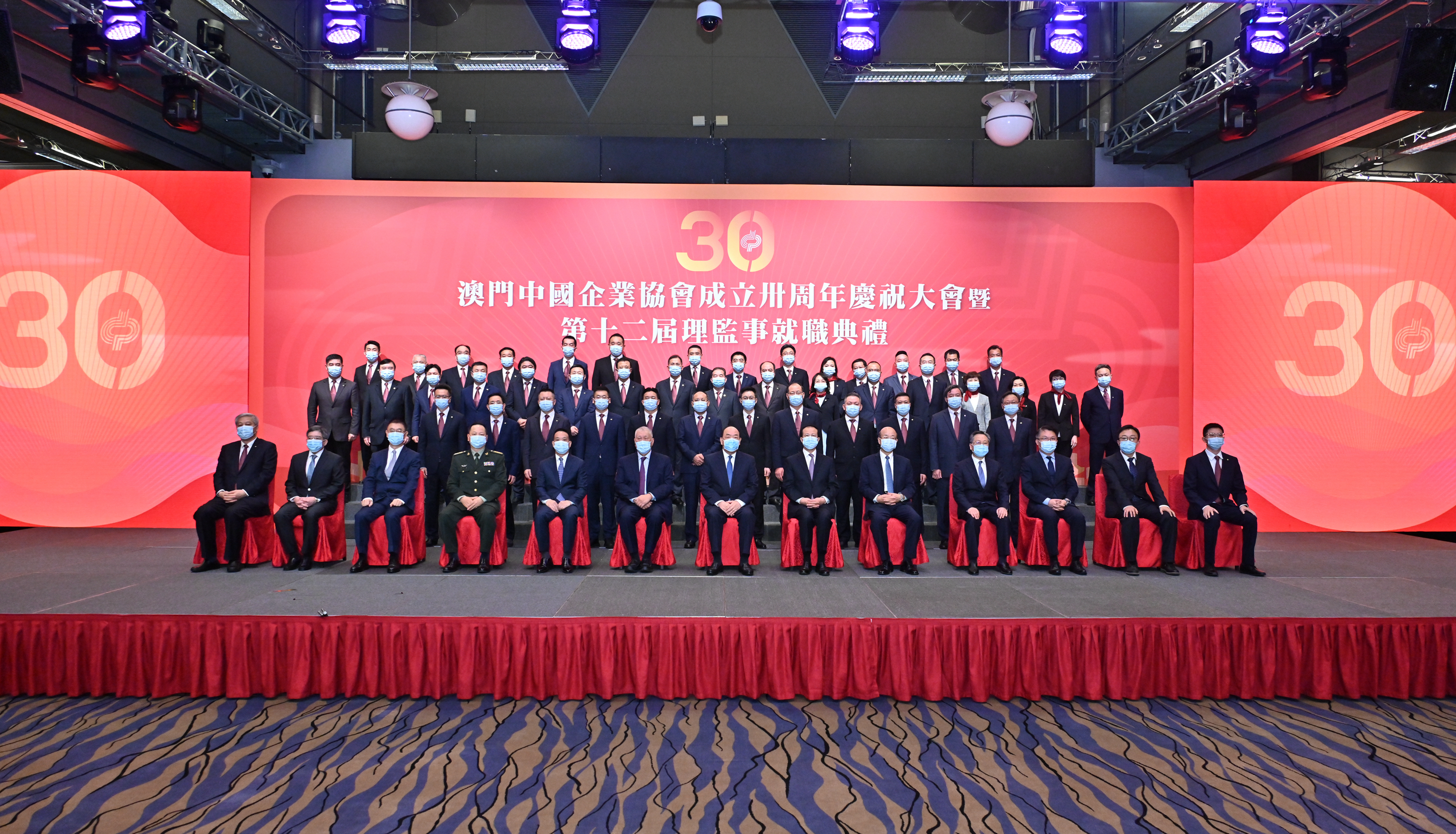 本网讯 11月30日下午,中央政府驻澳门联络办公室主任傅自应、副主任姚坚出席在澳门旅游塔举行的庆祝澳门中国企业协会成立三十周年暨第十二届理监事会就职典礼活动,并与澳门特别行政区行政长官贺一诚,全国政协副主席何厚铧,国务院港澳事务办公室副主任黄柳权,外交公署特派员刘显法,解放军驻澳门部队政治工作部主任窦国杰,澳门特别行政区立法会主席高开贤,澳门特区政府经济财政司司长李伟农、运输工务司司长罗立文,国务院国资委规划发展局副局长尚鹏,澳门中国企业协会会长傅建国、总干事黄智虎等共同主礼。