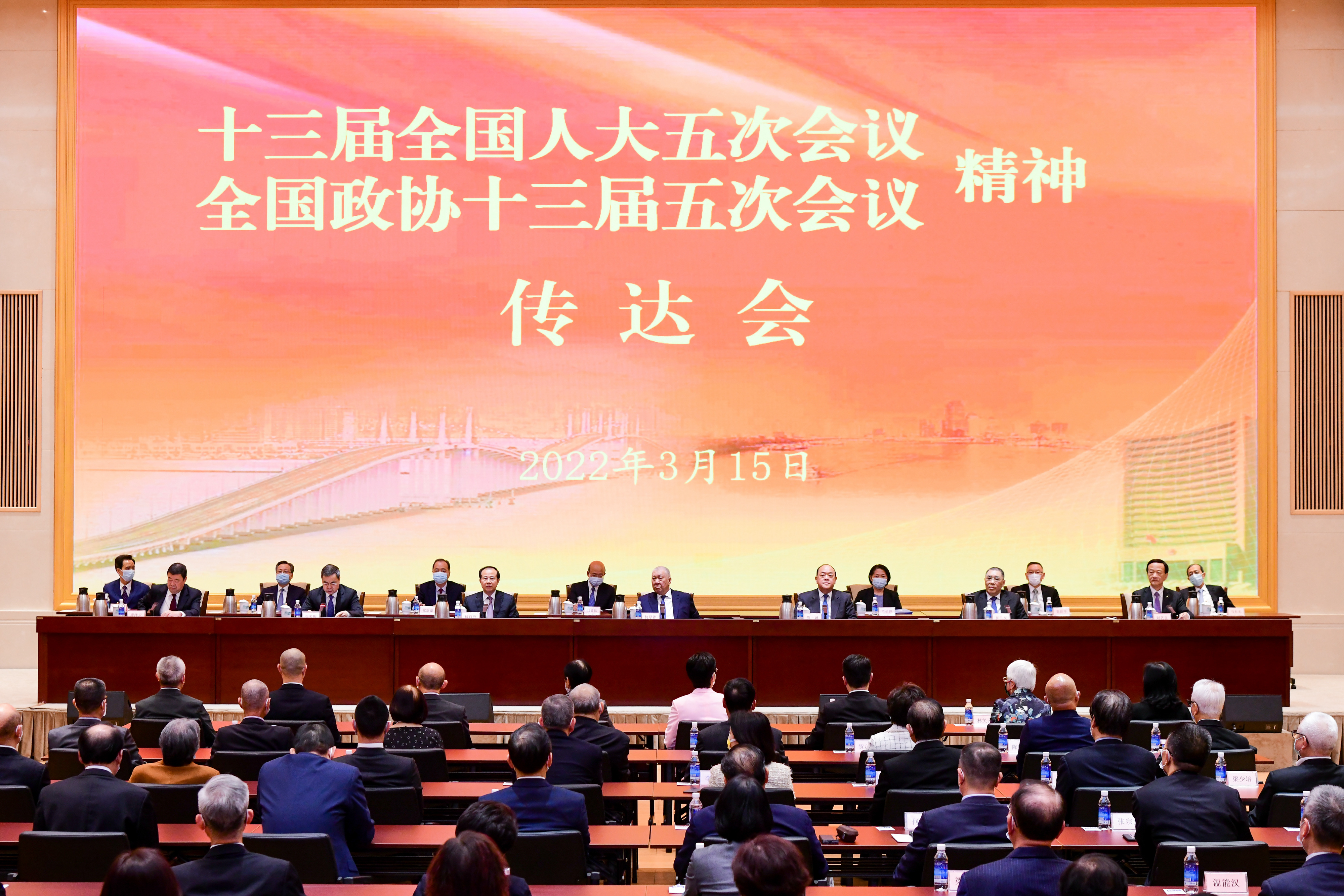 本网讯 3月15日下午,中央政府驻澳门联络办公室召开全国两会精神传达会。全国政协副主席何厚铧、澳门特区行政长官贺一诚、中央政府驻澳门联络办公室主任傅自应分别讲话,崔世安先生出席,澳区全国人大代表团团长刘艺良、全国政协常委廖泽云分别传达十三届全国人大五次会议、全国政协十三届五次会议精神。中央政府驻澳门联络办公室副主任张荣顺主持会议。外交部驻澳门特派员公署特派员刘显法,中央政府驻澳门联络办公室副主任严植婵、郑新聪参加会议。