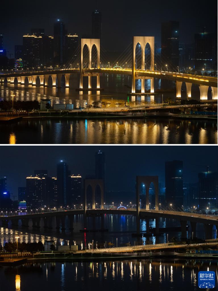 3月26日拍摄的熄灯前(上)和熄灯后的澳门西湾大桥(拼版照片)。当日,澳门多处建筑物于晚上8时30分关掉非必要的灯一小时,响应“地球一小时”活动。新华社记者 张金加 摄