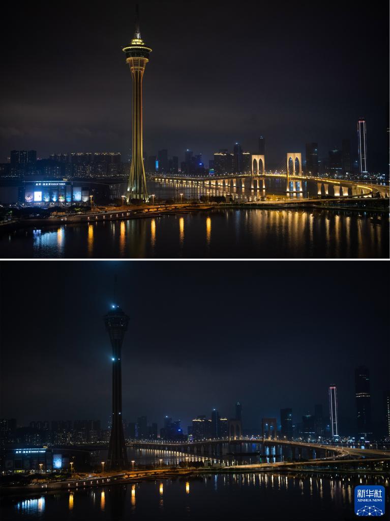 3月26日拍摄的熄灯前(上)和熄灯后的澳门旅游塔和西湾大桥(拼版照片)。当日,澳门多处建筑物于晚上8时30分关掉非必要的灯一小时,响应“地球一小时”活动。新华社记者 张金加 摄