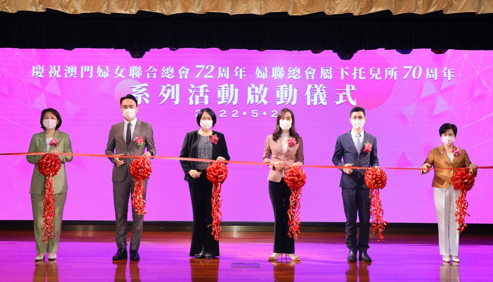 本网讯 5月20日上午,澳门妇女联合总会在澳门渡船街妇联综合服务大楼举办成立72周年暨属下托儿所成立70周年系列活动启动仪式,中央政府驻澳门联络办公室副主任严植婵出席,并与特区政府社会文化司司长欧阳瑜、社会工作局局长韩卫、教育及青年发展局局长龚志明,妇联总会会长刘金玲、理事长袁小菱共同主礼。